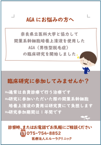 間葉系幹細胞培養上清液を使用したAGA治療の臨床研究となります。